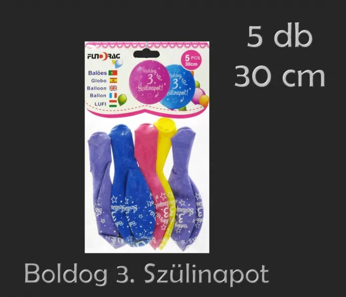 Boldog 3. Szülinapot feliratos lufi csomag, 5 db, 30 cm