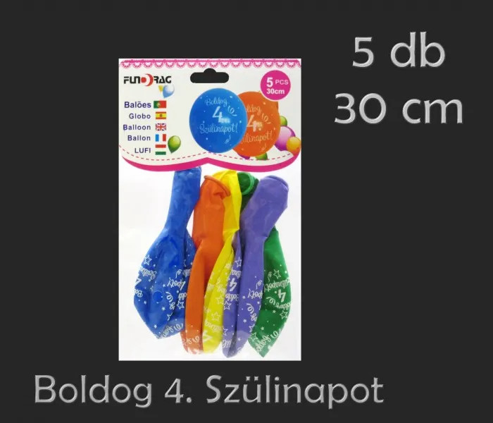 Boldog 4. Szülinapot feliratos lufi csomag, 5 db, 30 cm