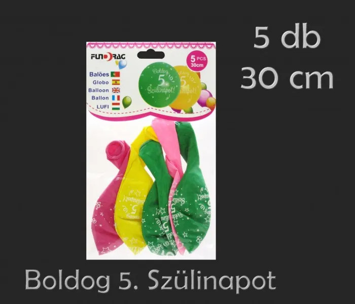 Boldog 5. Szülinapot feliratos lufi csomag, 5 db, 30 cm, 23555