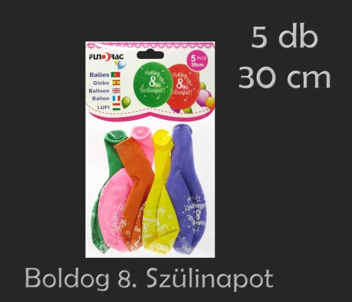 Boldog 8. Szülinapot feliratos lufi csomag, 5 db, 30 cm