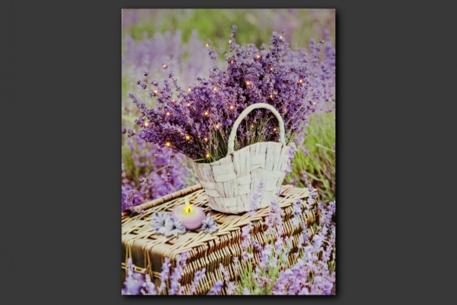 Világító falikép, levendula kosárban, 30 x 40 cm, 30 LED-es