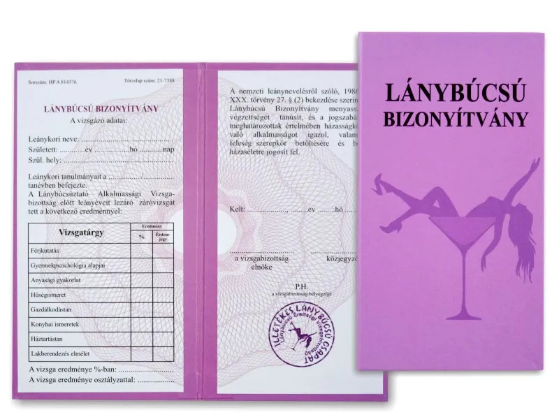 Ez az apró, mégis ötletes kiegészítő nemcsak jókedvet, hanem maradandó emléket is ad a menyasszonynak. Ha szeretnétek egy kis extra humort és kreativitást vinni a lánybúcsú programjába, ez a bizonyítvány garantáltan sikert arat a csapat körében.