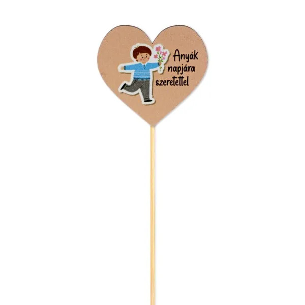 A természetes hatású szív forma és a mosolygós kisfiú grafikája igazán meghitt hangulatot teremt, így ideális kiegészítője lehet egy csokor virágnak, ajándéktasaknak vagy akár egy saját készítésű meglepetésnek. A 30 cm-es pálca praktikus és könnyen elhelyezhető, stabilan tart a virágok között vagy egy cserepes növényben.
