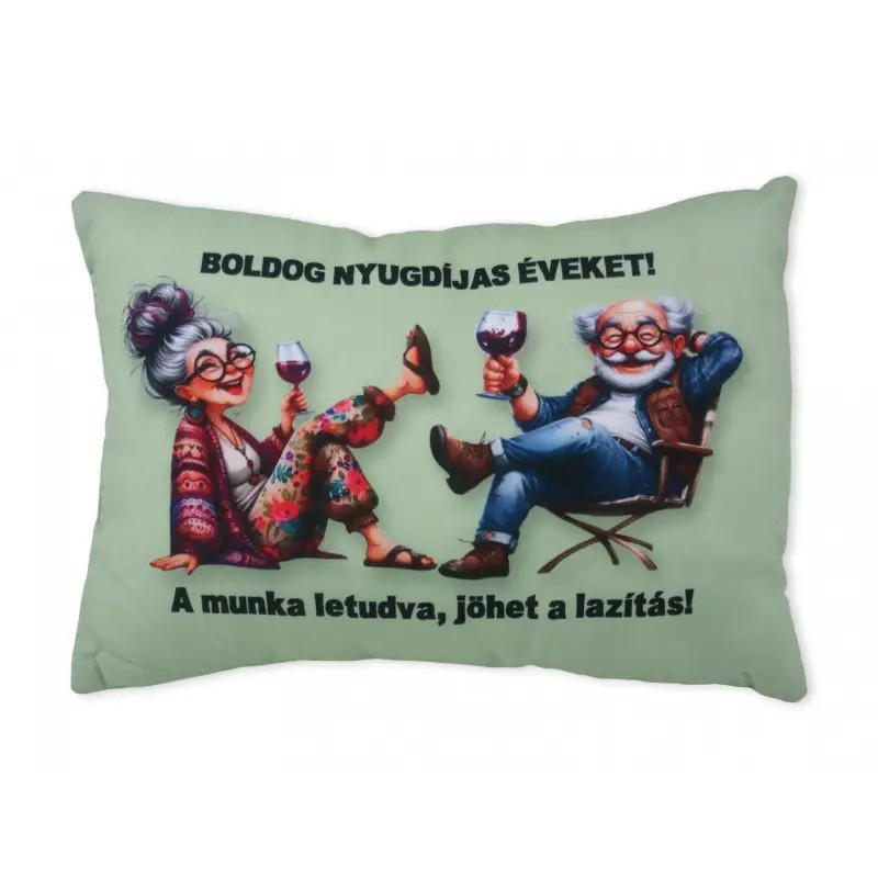 Egy korszak lezárul, és kezdődik a megérdemelt pihenés – ezt ünnepli ez a vidám hangulatú, 35 x 25 cm méretű díszpárna, amely tökéletes ajándék nyugdíjba vonulás alkalmából. A párnán látható mosolygós idős pár és a humoros felirat azonnal jókedvre derít, és garantáltan mosolyt csal az ünnepelt arcára.