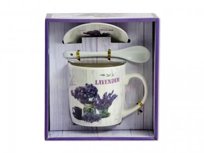 Levendulás bögre tetővel és kanállal ajándék szett