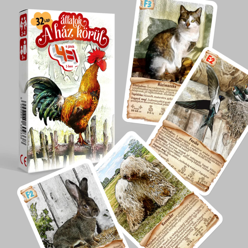Fedezd fel a vidéki élet izgalmas világát az Állatok a ház körül 4 az 1-ben kártyajátékkal, amely egyszerre szórakoztat és tanít, miközben közelebb hozza a gyerekekhez a háziasított állatok mindennapjait.