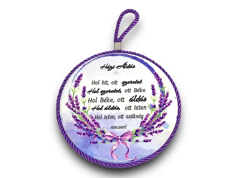 Ez a bájos, házi áldás feliratos edényalátét nemcsak praktikus kiegészítője a konyhának vagy az étkezőasztalnak, hanem egy meghitt hangulatot árasztó dekoráció is egyben. A finom levendulás mintával és szívhez szóló szöveggel díszített alátét igazi otthonosságot sugároz, így minden étkezésnél emlékeztet a szeretet, béke és harmónia fontosságára.