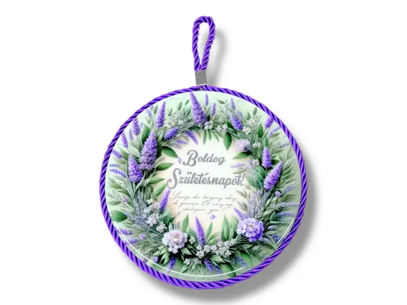 Tedd még különlegesebbé a születésnapi ünneplést ezzel a ,,Boldog születésnapot” feliratos, dekoratív edényalátéttel, amely egyszerre praktikus és szívhez szóló ajándék. A gyönyörű, levendulás koszorúval díszített minta finom, elegáns hangulatot teremt, így tökéletes kiegészítője lehet az ünnepi asztalnak, miközben maradandó emlékként is szolgál.