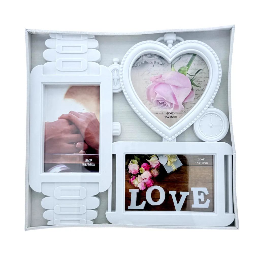 A keret kialakítása játékos és mégis elegáns, hiszen a klasszikus téglalap alakú fotóhelyek mellett egy szív formájú képkeret is helyet kapott, amit a Love felirat tesz igazán különlegessé. Ez az elrendezés lehetőséget ad arra, hogy egy történetet mesélj el képekben, legyen szó egy kapcsolat fontos állomásairól, családi pillanatokról vagy akár baráti emlékekről. A letisztult fehér szín kiemeli a fotók színeit, és könnyedén illeszkedik modern, romantikus vagy klasszikus lakberendezési stílushoz is.