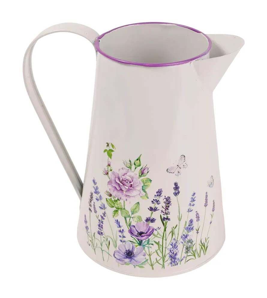 Ez a lila virágmintás bádog kiöntő igazán bájos darab, amely finoman hozza el a természet nyugalmát az otthonodba, miközben a klasszikus forma és a romantikus virágos díszítés együttese időtálló hangulatot teremt. A világos alapszínen megjelenő levendulás és lila árnyalatú virágok friss, tavaszias érzetet adnak, így ez a kiöntő nemcsak praktikus kiegészítő, hanem mutatós dekoráció is lehet bármely helyiségben.