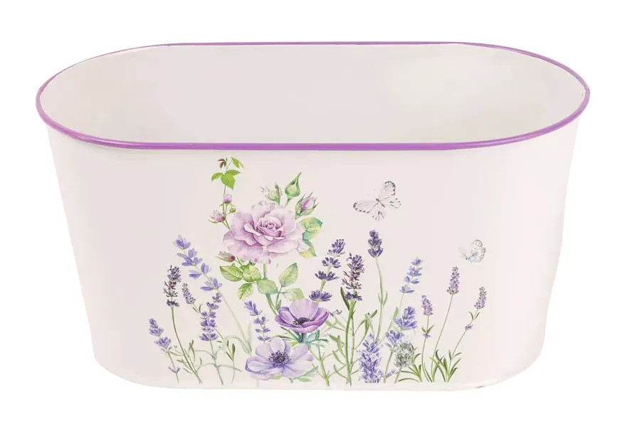 Ez az ovál alakú, lila virágmintás bádog kaspó igazán hangulatos kiegészítője lehet az otthonodnak, ha szereted a finom, természetközeli dekorációkat. A világos alapszínt gyönyörű levendulás és lila árnyalatú virágok díszítik, melyek friss, tavaszias hangulatot árasztanak, miközben kellemesen romantikus megjelenést adnak a kaspónak. Letisztult formája és lágy színvilága miatt könnyedén beilleszthető vidéki, shabby chic vagy akár modern enteriőrbe is.