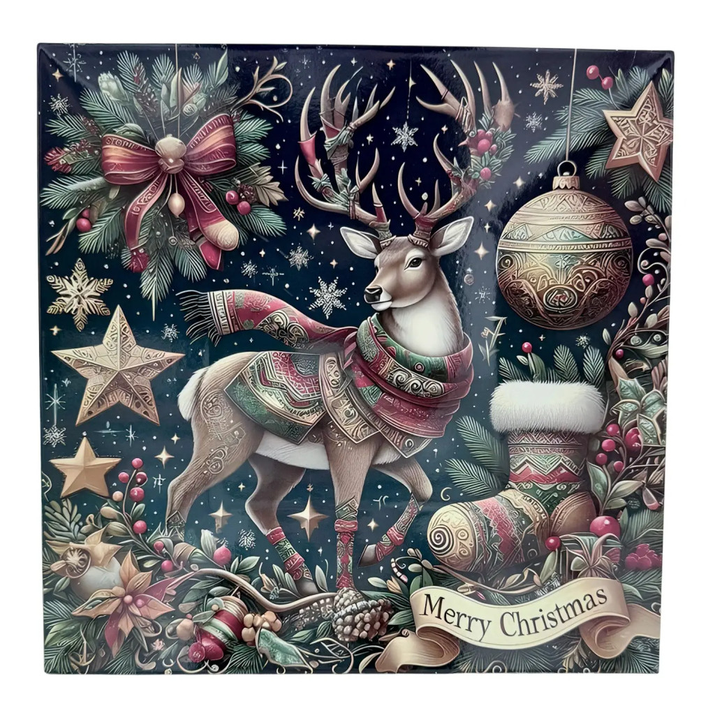 Ha szereted, amikor az ünnepi hangulat már az apró részletekben is megmutatkozik, akkor ez a gyönyörű karácsonyi rénszarvas mintás tálca biztosan elvarázsol majd. A tálca egy elegáns, részletgazdag grafikával díszített, amelyen egy díszes sálat és bundát viselő rénszarvas áll a középpontban, körülötte arany csillagok, fenyőágak, bogyók és karácsonyi díszek ragyognak a mélykék háttér előtt. A „Merry Christmas” felirat finoman teszi teljessé a hangulatot, így minden ránézéskor a karácsony varázslatos világát idézi.