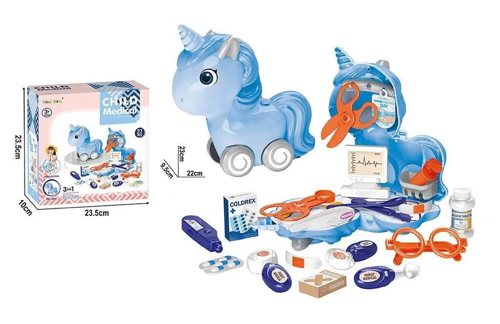 Ez a 27 darabos pónis doktor szerepjátékszett igazi telitalálat minden olyan kisgyerek számára, aki imád gondoskodni, gyógyítani és közben egy tündéri pónival játszani. A szett központi eleme a bájos, kerekeken guruló póni figura, amely nemcsak a játék közben válik hű társává a gyerekeknek, hanem húzható is, sőt a mellékelt pánt segítségével akár vállra is köthető, így mindenhová magukkal vihetik.
