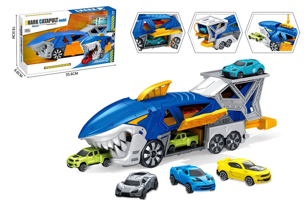 Merülj el a végtelen kalandok világában az Autó Kilövős Cápa Játékkal! Ez a fantasztikus játék kombinálja a hagyományos autós játékok izgalmát egy lenyűgöző cápa formájú kamionnal, ami képes szállítani a csomagolásban található két kisautót.