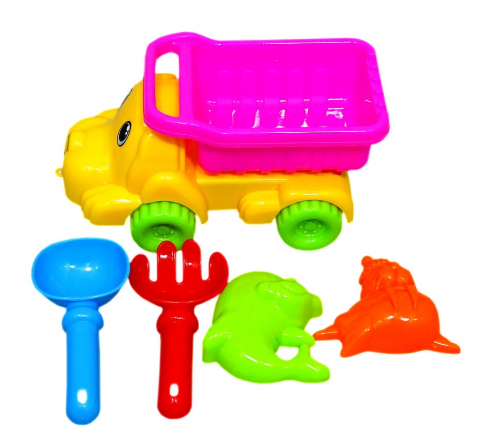 A szett 1 db homokozó dömpert, 1 db homokozó lapátot, 1 db homokozó gereblyét és 2 db homokozó formát tartalmaz.