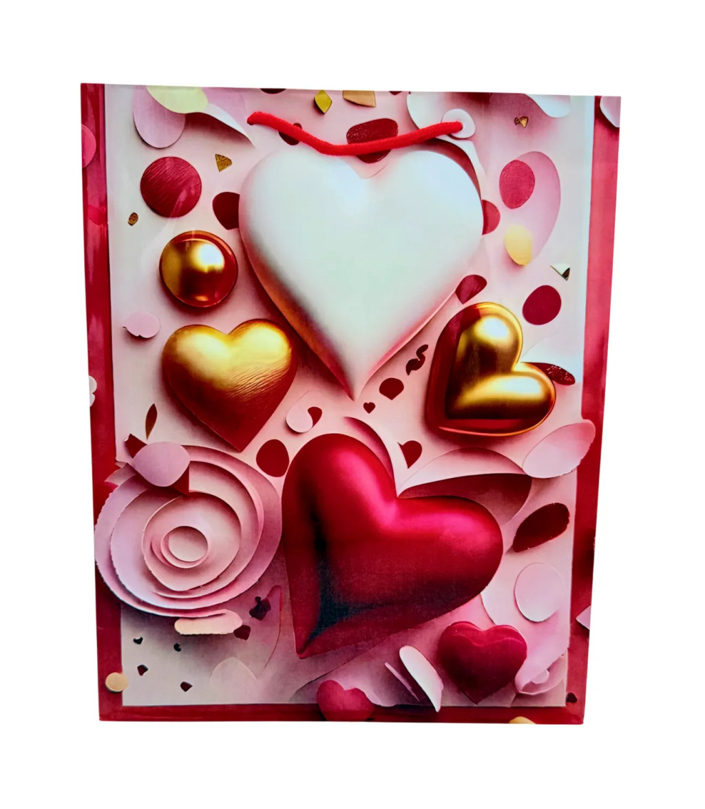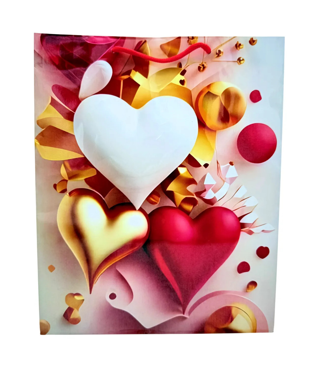 Ez a szívmintás papírtasak tökéletes választás, ha szeretnéd az ajándékozást igazán meghitté és emlékezetessé tenni. A romantikus hangulatú dizájn, a piros, arany és fehér színek harmonikus kombinációja, valamint a játékos szív motívumok már első pillantásra is melegséget és szeretetet sugároznak, így garantáltan mosolyt csalnak az ajándékozott arcára.