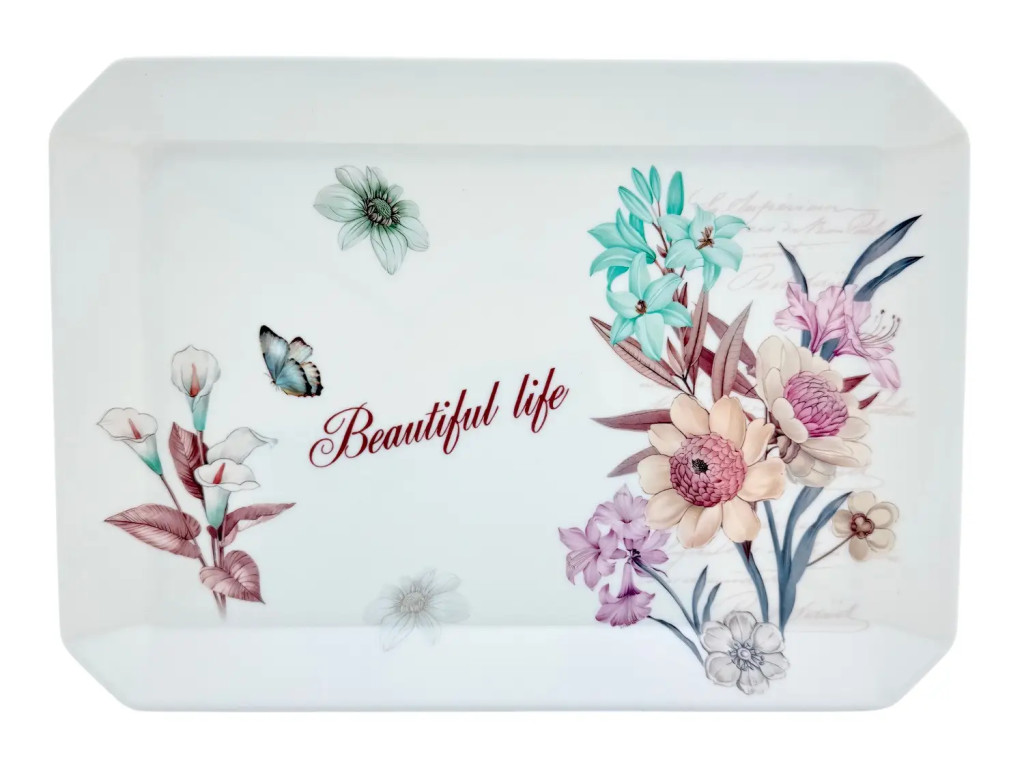 Ez a különleges tálca már első pillantásra is finom eleganciát és nyugodt hangulatot áraszt, a lágy pasztellszínekben megjelenő virágminták és a kecses pillangó motívum pedig igazán harmonikus összképet alkotnak. A középen elhelyezett Beautiful life felirat kellemes üzenetet hordoz, amely tökéletesen illik a mindennapi apró örömökhöz és az otthon meghitt pillanataihoz.