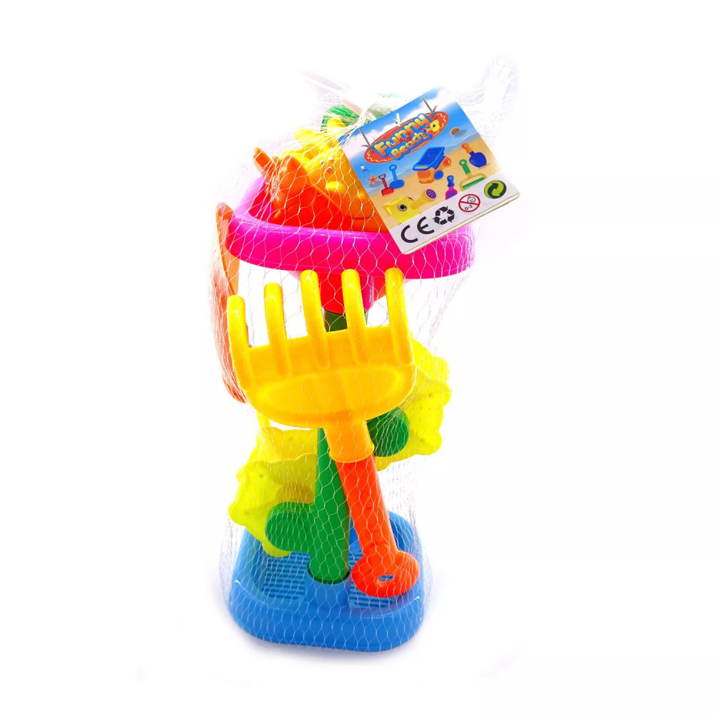 A szett 1 db lapátot, 1 db gereblyét, 4 db homokozó formát és 1 db homokozó malmot tartalmaz.