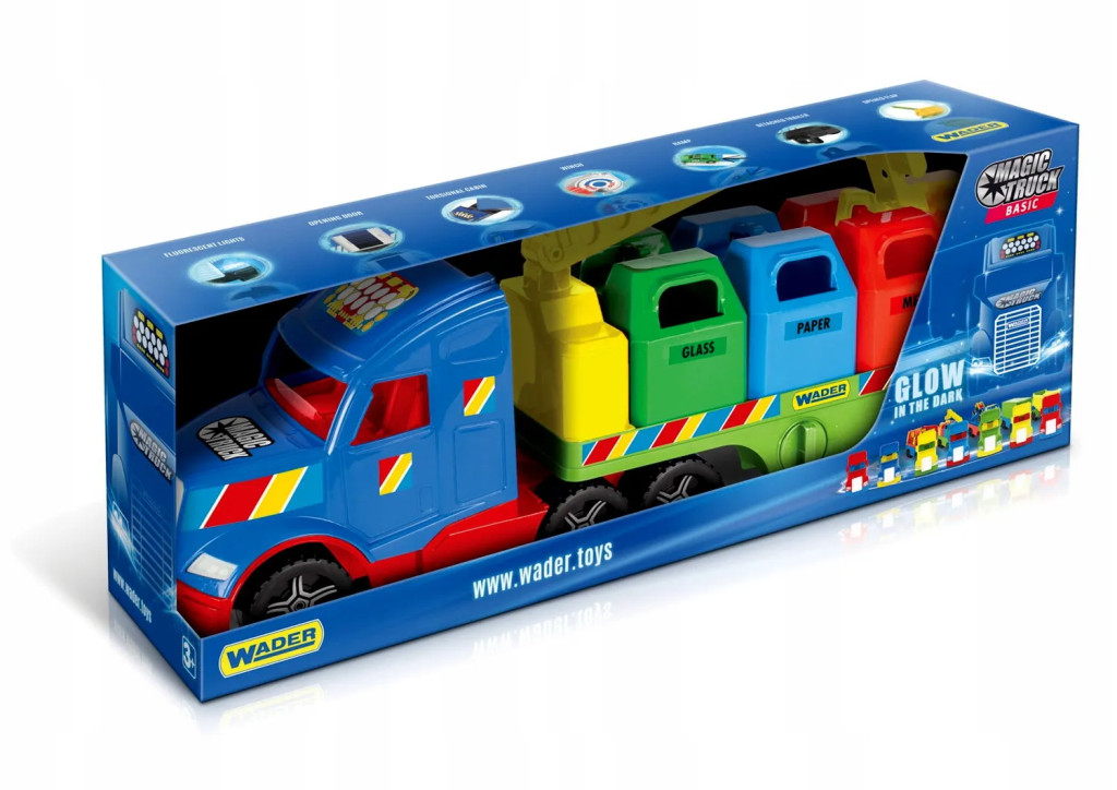 A Wader ismét egy hatalmas járgánnyal kedveskedik a gyerekeknek, akik most egy szelektív hulladékgyűjtésre alkalmas kukásautóval gazdagodhatnak. A nagyméretű jármű, erős műanyagból készült és vidám színekben pompázik, az utánfutóján daruval illetve szelektív szemétgyűjtő konténerekkel van felszerelve.