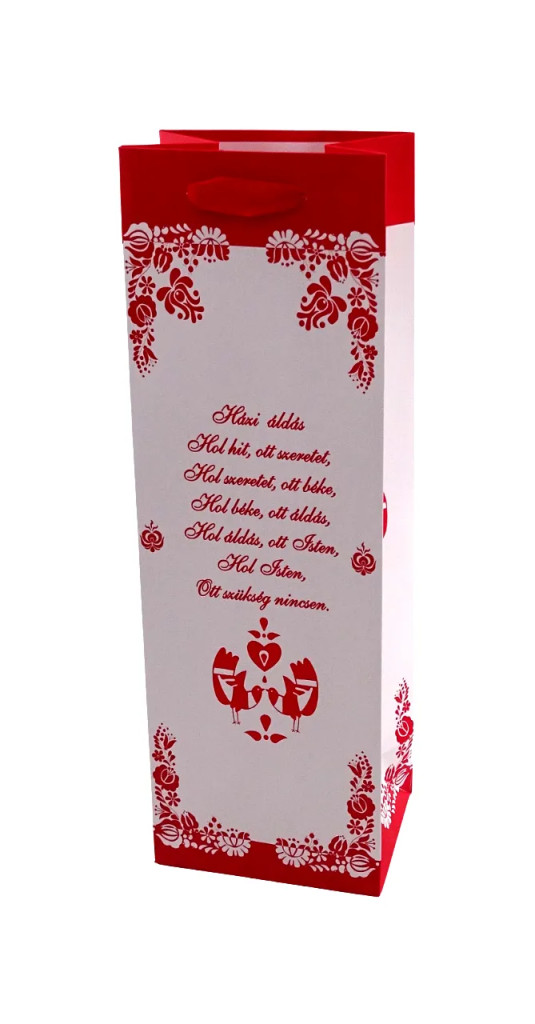 Adj különleges és meghitt csomagolást ajándékodnak ezzel a 12 x 36 cm-es boros papírtáskával, amelyet a hagyományos magyar házi áldás felirata díszít. A fehér alapon piros népi motívumok és a klasszikus szöveg időtlen eleganciát sugallnak, így a táska nemcsak praktikus, hanem szimbolikus értéket is képvisel.