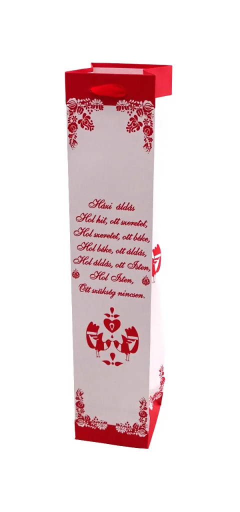 Adj stílusos és különleges megjelenést ajándékodnak ezzel a 8 x 38 cm-es pálinkás papírtáskával, amelyet a hagyományos magyar házi áldás felirata díszít. A piros-fehér színvilág és a népi motívumok nemcsak elegánssá, hanem igazán egyedivé is teszik, így tökéletes választás bármilyen alkalomra, legyen szó születésnapról, névnapról, karácsonyról vagy családi összejövetelről.